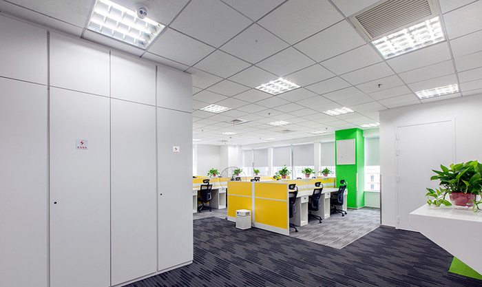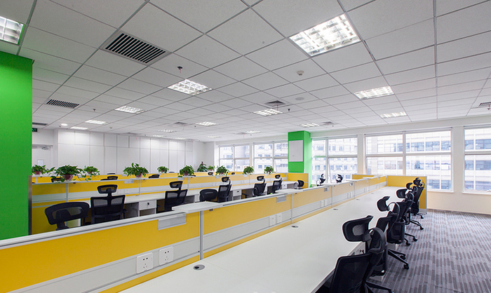 2、天花板裝飾:寫字樓天花板裝修力求簡潔,建議大家采用石膏板和礦棉板或鋁扣板吊頂,而且只在重點區域,如接待區、會議室做一些石膏板造型天花,其他地方則是采用礦棉板天花,沒有任何造型可言;