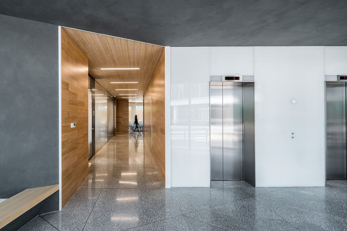 公共走道設計:用現代感強的深灰色作為主色調,而在會議室相對私密的走道,以木質材質為主,形成了空間的包裹感受,對不同區域空間進行區分。