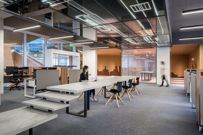 在開敞辦公區域設計中,設計將空間所必需的設備管線、橋架等隱藏在居中的吊頂內,吊頂下空間相對較低的位置,被設置為茶歇和交流區。在空間設計中以城市天際線為設計元素,同時工業化的設計,給了企業不一樣的特性。
