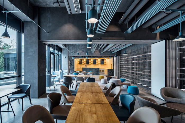 多功能咖啡館設計:是地下空間重點區域,作為員工休息放松的場所,這里定位為年輕、包容、靈活、互動,在休閑咖啡外還集合沙龍、課堂、派對為一體的集合咖啡館。