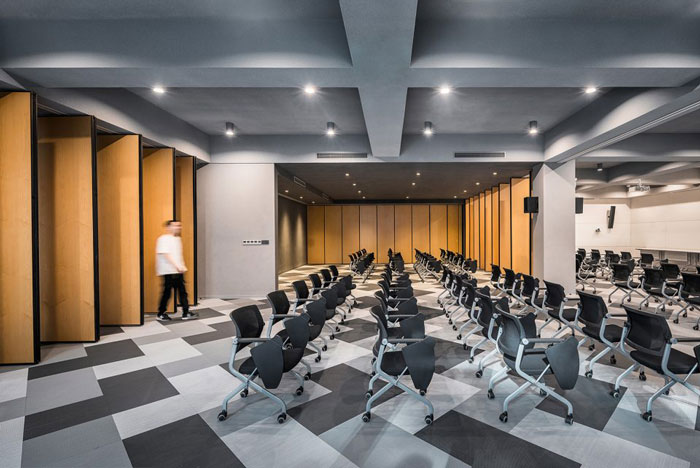 多功能廳設計:一面墻設置為白色烤漆玻璃和投影面,另外三個面和中央,通過可旋轉和平移的隔斷設置,可以根據使用行為,劃分出不同的空間狀態。
