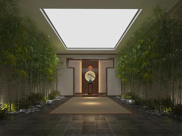 【新中式酒店裝修設(shè)計】冥想?yún)^(qū)域:此處是設(shè)計師的意外之作,因為設(shè)計師在設(shè)計的時候去過一次竹園,在哪里設(shè)計師感受到了自然的魅力,同時也感受到自己在哪里得到了某種升華,其中的感覺只可意會不可言傳,故此設(shè)計師希望將其安置在空間之中,讓來往的客戶在這里尋找那縹緲無蹤的感覺。
